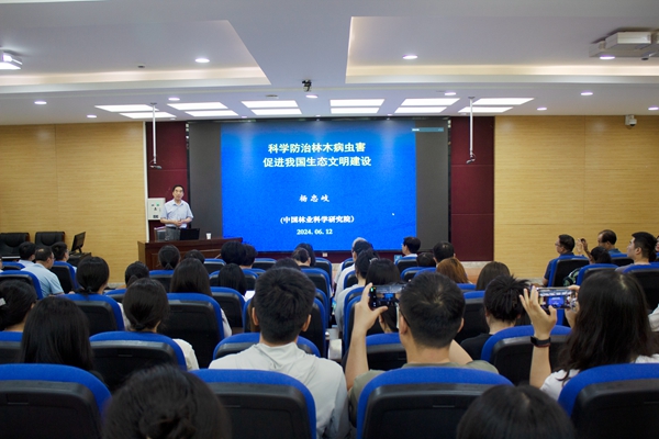 报告会上,杨忠岐教授首先饱含深情地回顾了自己在母校的求学经历,分享了自身工作学习历程,表达了对母校的深厚情感,同时也对即将到来的母校九十年华诞表示诚挚祝福。随后,他从生物防治入手,分析了近年来我国重要林木害虫的生物防治现状和以利用天敌昆虫为主的生物防治取得的一系列科研成果。他着重介绍了利用本土天敌白蛾周氏啮小蜂和HcNPV病毒防治美国白蛾的新技术、利用引进的捕食性天敌大唼蜡甲成功控制外来入侵重大害虫红脂大小蠹的技术、利用黑光灯、不育剂和花绒寄甲等天敌昆虫综合防治栗山天牛的技术、利用花绒寄甲成功防治危害泰山、孔府千年古槐的技术,人工合成饲料繁育椰心叶甲天敌技术、白蜡窄吉丁在美国的危害现状及天敌防治技术,以及利用花绒寄甲、川硬皮肿腿峰控制松材线虫病媒介昆虫松褐天牛的技术及其应用前景等。近3个小时的精彩分享,杨忠岐教授用生动活泼的现实事例,将理论与实践紧密结合,为相关领域的研究提供了新的思路和启示。