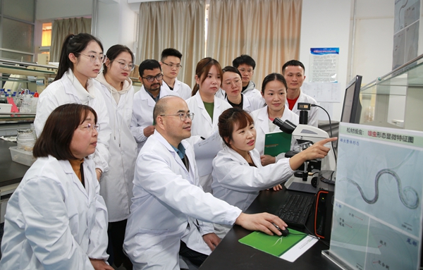 唐光辉教授(前排中)与团队成员贺虹、李培琴、张正青等在研讨松材线虫病的防控
